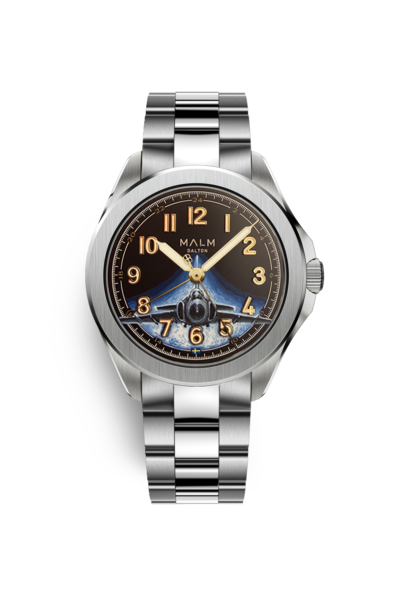 Rooted in Swedish aviation heritage, the Dalton watch is a reference within Swedish pilot watches, originally developed in collaboration with the 212th Fighter Jet Squadron, call sign Dalton. Created as a tribute to Swedish aviation history and to celebrate the 100th anniversary of the Swedish Air Force, this Anniversary Edition features a hand-painted dial depicting the iconic 37 Viggen, designed and painted by Mythic Scandinavian Watch Art. Each dial is painted to order, making every watch a unique expression of craftsmanship and storytelling.