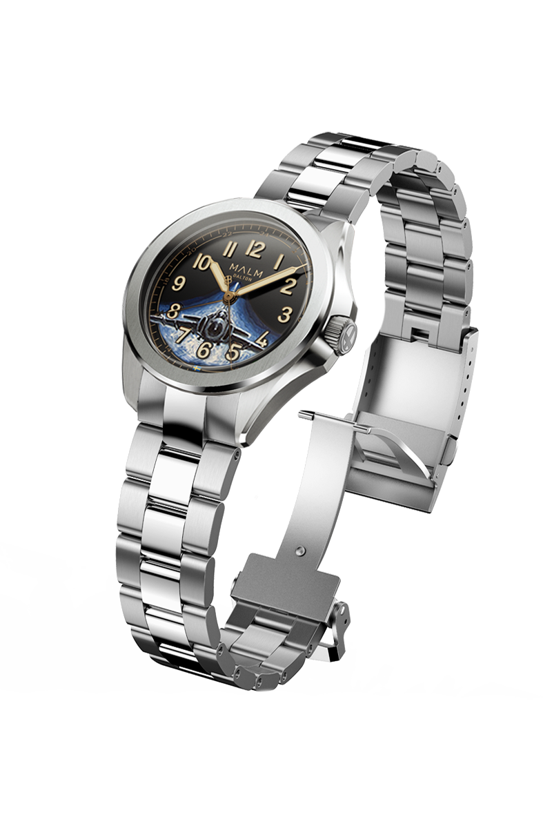 The watch is based on the Dalton Automatic 38, a refined evolution of the original Dalton model introduced in 2019—the very first watch released by MALM. Its 38 mm case reflects classic pilot watch proportions, while the automatic movement with UTC complication adds modern functionality. The design remains faithful to its origins, combining clarity, balance, and aviation-inspired details.